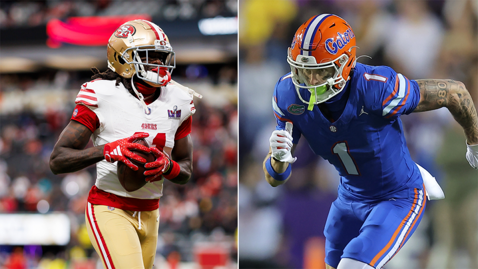 The San Francisco 49ers selected Florida wide receiver Ricky Pearsall, right, with the 30th pick in the NFL Draft on Thursday, prompting further speculation on the future of 49ers wide receiver Brandon Aiyuk, left. (Getty Images)