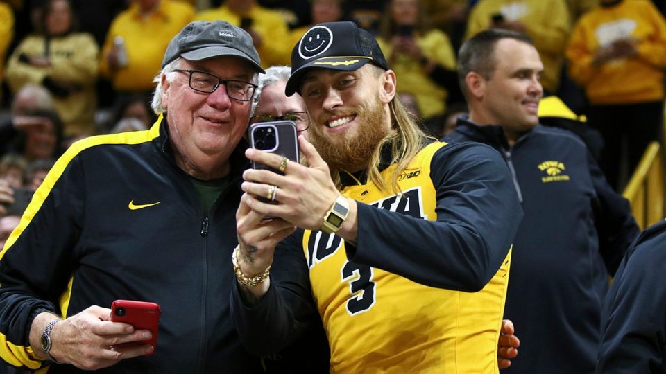 Tight end George Kittle of the San Francisco 49ers takes a photo with fans before a game between the Iowa Hawkeyes and the West Virginia Mountaineers during the 2024 NCAA Women’s Tournament at Carver-Hawkeye Arena March 25, 2024, in Iowa City, Iowa. (Matthew Holst/Getty Images)