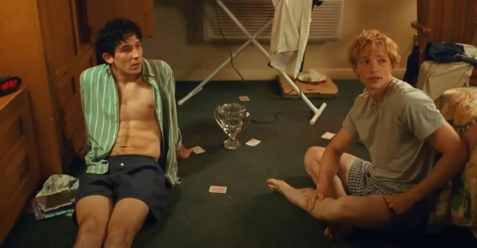 Josh O'Connor and Mike Faist sit on the floor in a still from "Challengers"