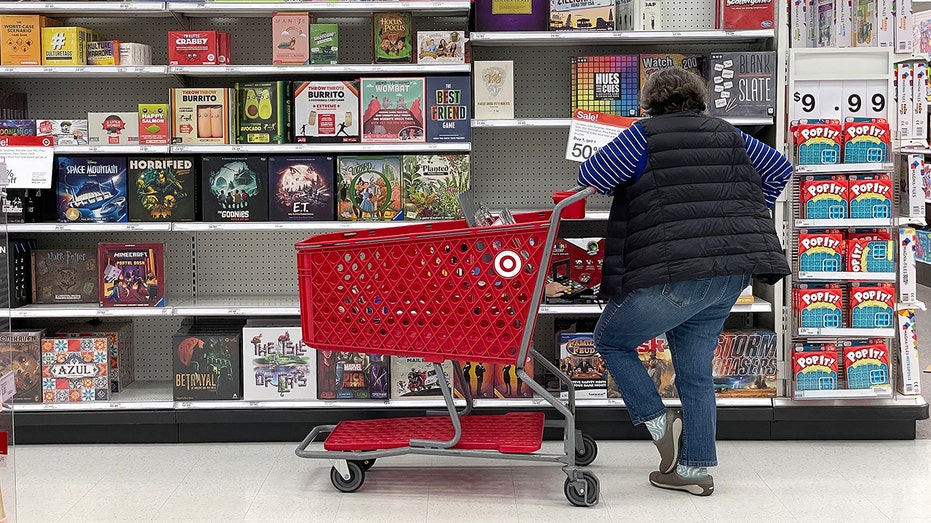 Woman stands with shopping cart in front of games
