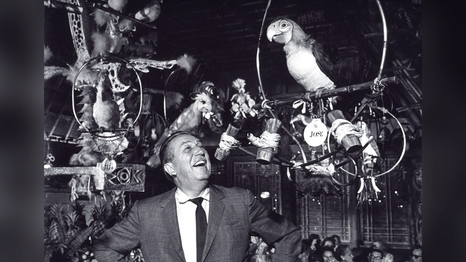 Walt Disney beams at talking macaw Jose in Walt Disney’s Enchanted Tiki Room in Disneyland Park, in 1963. (Disney / Fox News)