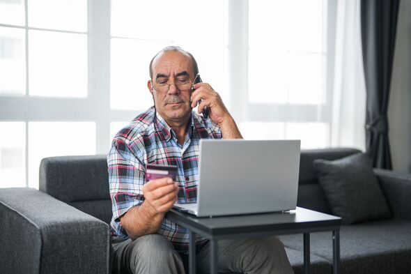 Scammed senior man with glasses is talking on the phone with a credit card in his hand in the living room of the house