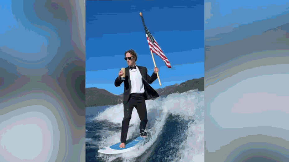 To celebrate the Fourth of July, Meta founder Mark Zuckerberg posted a video to Instagram in which he surfs while wearing a tuxedo, carrying an American flag and sipping beer. (@zuxk via Instagram / Fox News)