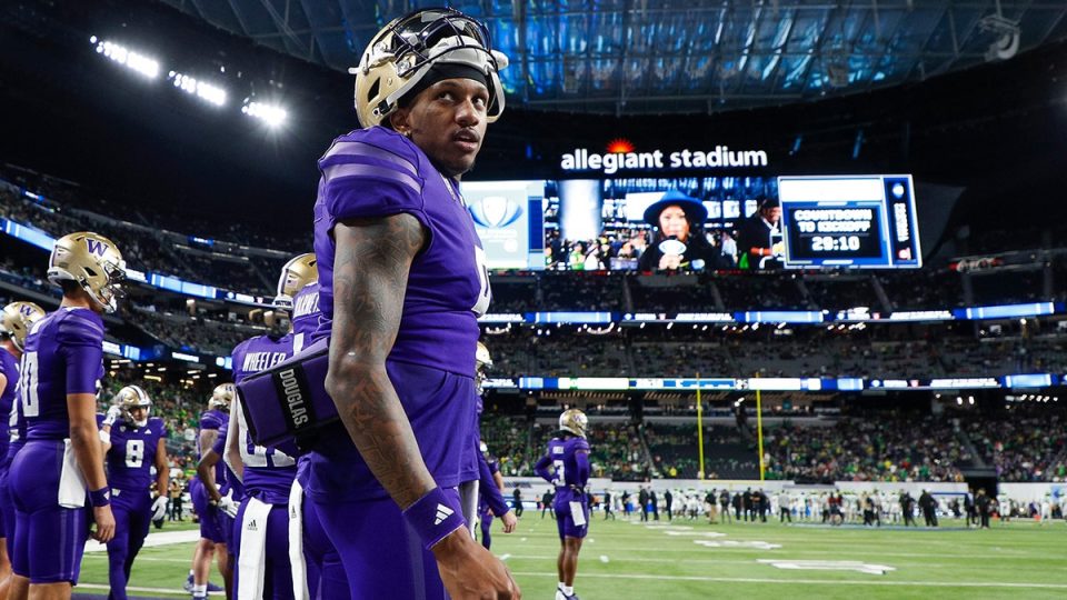 Michael Penix Jr., #9 of the Washington Huskies, looks on prior to the Pac-12 Championship game against the Oregon Ducks at Allegiant Stadium on December 1, 2023, in Las Vegas, Nevada.  (Brandon Sloter/Image Of Sport/Getty Images)