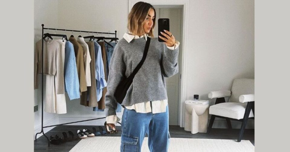 “Just a cute Saturday with the gals,” she wrote and shared a selfie of her “outfit of the day” – a white striped shirt under an oversized grey sweater and a baggy cargo jeans with cult-favourite Adidas Samba trainers.