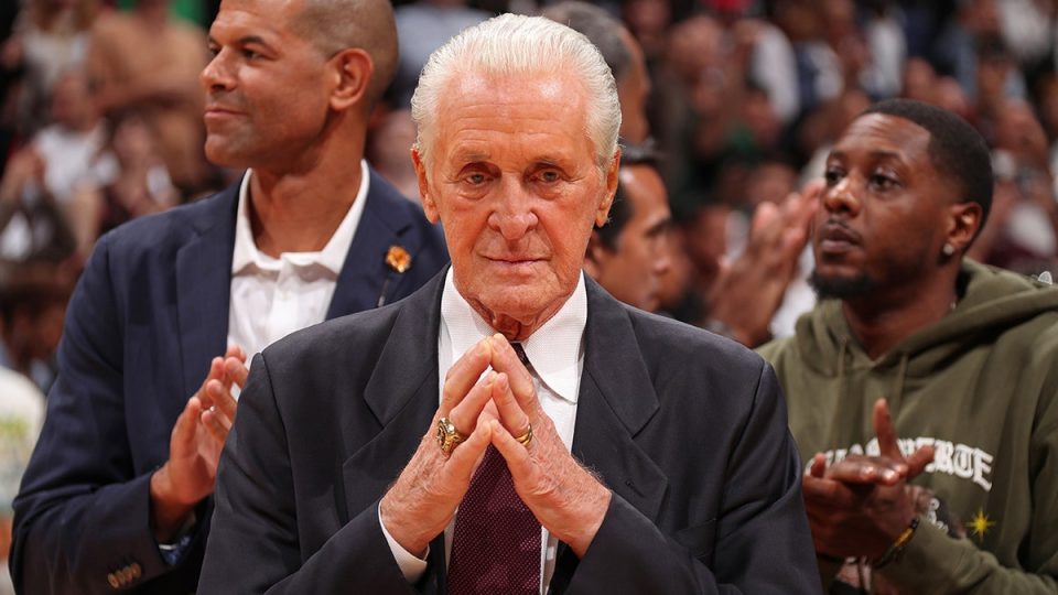 Pat Riley looks on during Udonis Haslem jersey Retirement on January 19, 2024 at Kaseya Center in Miami, Florida. (Issac Baldizon/NBAE via Getty Images)