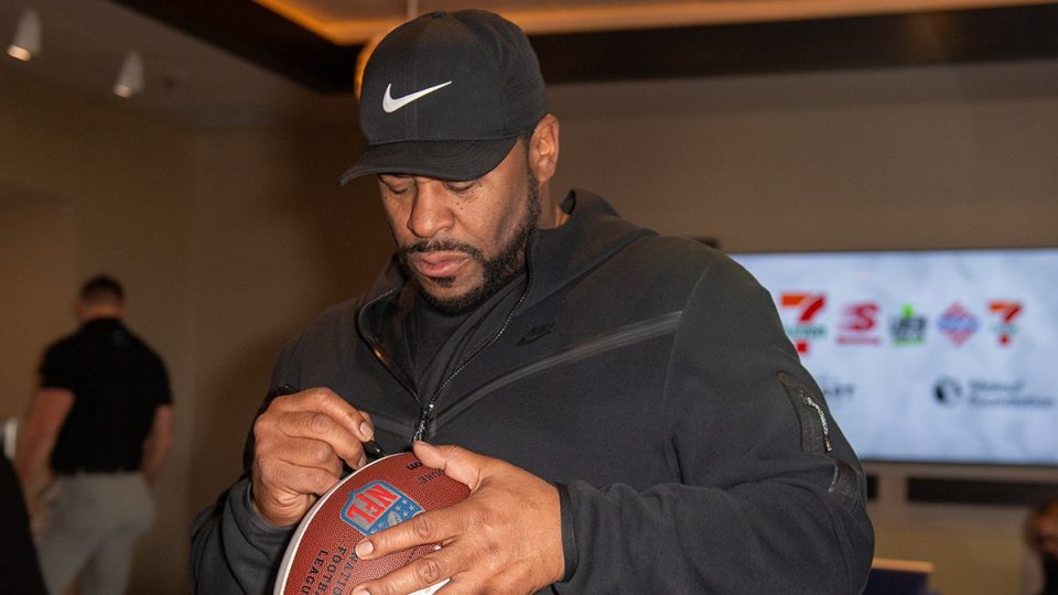 Jerome Bettis signs a football during Touchdowns on the Green, the Inaugural Tim & Sherice Brown Celebrity Golf Invitational to Blitz Human Trafficking before Super Bowl LVIII at Topgolf Las Vegas on Feb. 8, 2024 in Las Vegas. (Aaron J. Thornton/Getty Images)