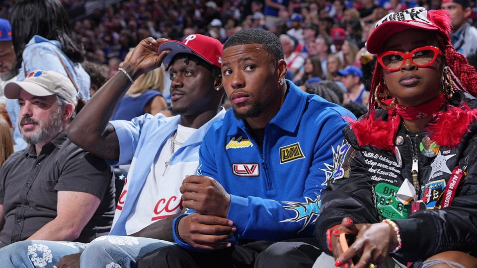 A.J. Brown and Saquon Barkley attends the game between the New York Knicks and the Philadelphia 76ers during Round 1, Game 6 of the 2024 NBA Playoffs on May 2, 2024, at the Wells Fargo Center in Philadelphia, Pennsylvania. (Jesse D. Garrabrant/NBAE via Getty Images)