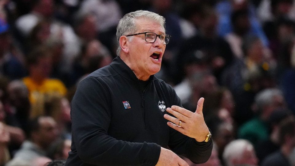Head coach Geno Auriemma of the Connecticut Huskies celebrates after his team’s 80-73 win against the USC Trojans in the Elite Eight of the NCAA Tournament at Moda Center April 1, 2024, in Portland, Ore. (Soobum Im/Getty Images)