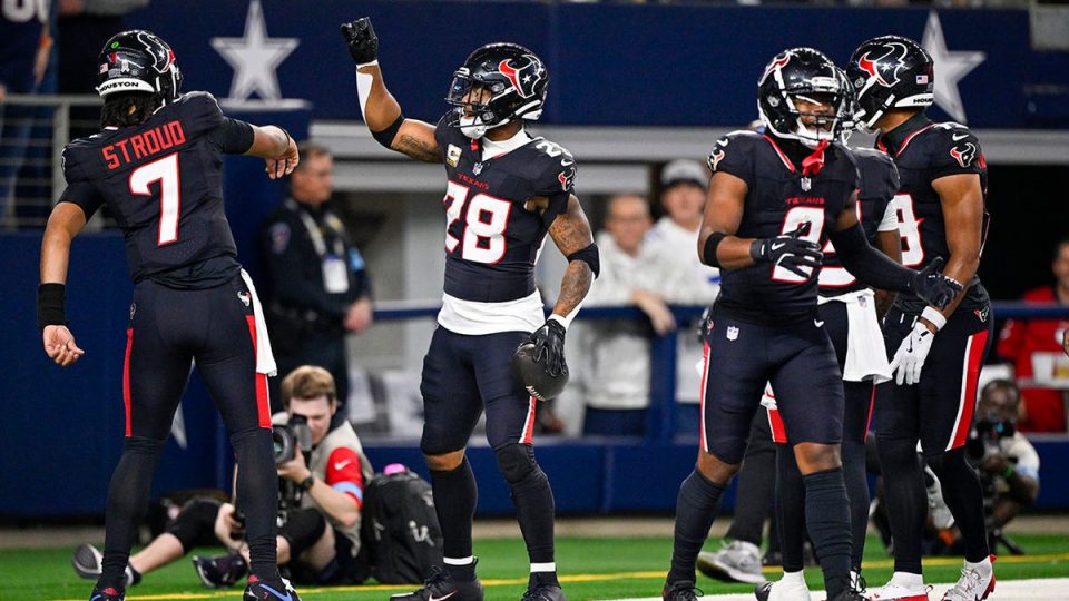 Houston Texans running back Joe Mixon, #28, and quarterback C.J. Stroud, #7, celebrate Mixon’s touchdown run against the Dallas Cowboys during the first half of an NFL football game on Monday, Nov. 18, 2024 in Arlington, Texas. (AP Photo/Jerome Miron)