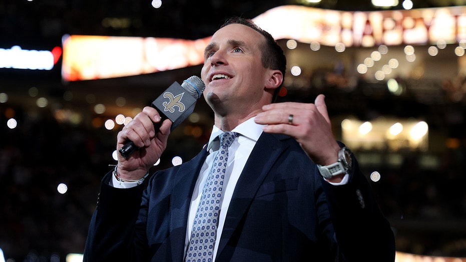 Former New Orleans Saints quarterback Drew Brees speaks to the fans during halftime of a game against the Buffalo Bills at Caesars Superdome Nov. 25, 2021, in New Orleans. (Chris Graythen/Getty Images / Getty Images)