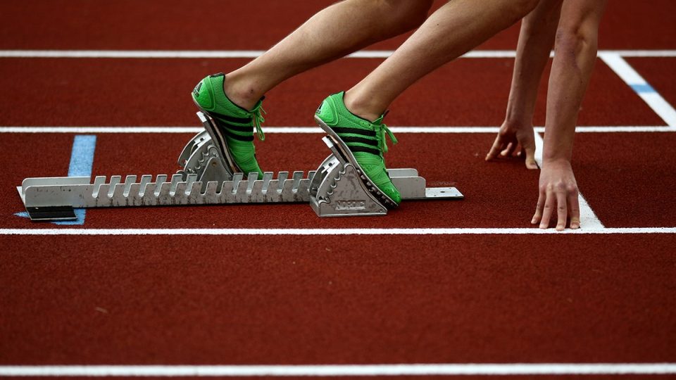 A runner warms up on starting blocks before a competition. (John Walton – PA Images via Getty Images)