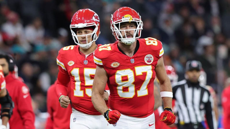 Patrick Mahomes of Kansas City Chiefs and teammate Travis Kelce during the Miami Dolphins game at Deutsche Bank Park on Nov. 5, 2023, in Frankfurt, Germany. (Ralf Ibing – firo sportphoto/Getty Images)