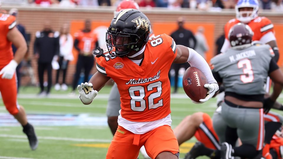 Wide receiver Javon Baker of Central Florida (82) during the 2024 Reese’s Senior Bowl Feb. 3, 2024, at Hancock Whitney Stadium in Mobile, Ala.  (Michael Wade/Icon Sportswire via Getty Images)