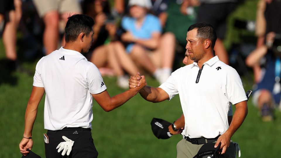 Collin Morikawa and Xander Schauffele shake hands on the 18th green during the third round of the PGA Championship at Valhalla Golf Club on May 18, 2024, in Louisville, Kentucky. (Andrew Redington/Getty Images)