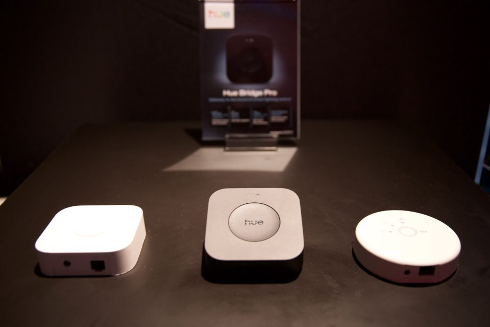 The new Hue Bridge Pro (center) is the third generation of the company’s Zigbee hub.