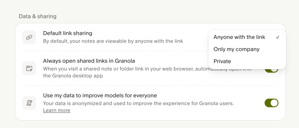 You can change who can view your links by opening Granola, selecting your profile in the bottom-left corner of the screen, and then choosing “Settings.” From there, navigate to the “Default link sharing” option, and change “Anyone with the link” to either “Only my company” or “Private.” If you delete your note, people with the link will no longer be able to access it.