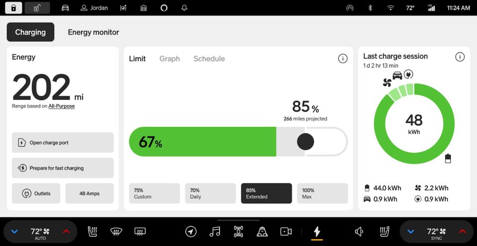 The Energy app will also now include two tabs: “Charging” for energy intake and “Energy Monitor” for energy output. The Charging tab shows EV owners how much energy is flowing directly into their battery pack during a charge session, as compared to the energy being used by other vehicle systems.