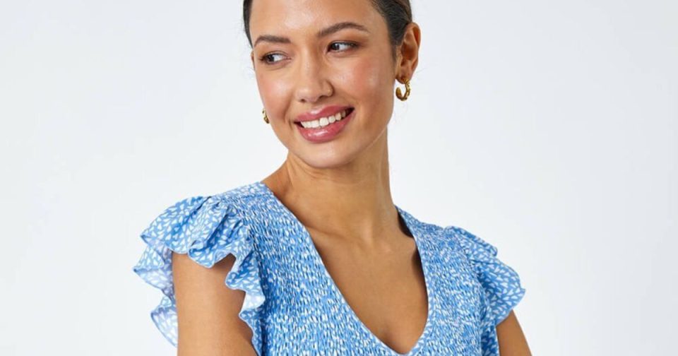 Touted on the Roman website as crafted from a ‘light woven fabric’, the charming light blue Ditsy Print Shirred Midi Dress features a ‘cosy shirred bodice with adorable frill detail on the short sleeves’. It’s complemented by a ‘gathered skirt’ which ‘gives rise to the breezy fit and flare silhouette, perfect for both beach getaways and alfresco soirees’.