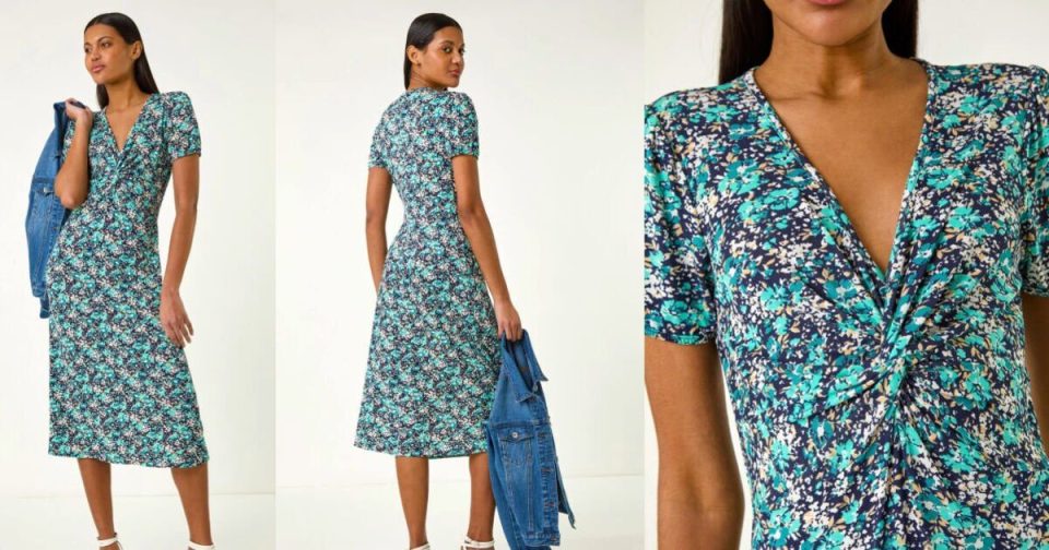 Roman shoppers have left several reviews on the website, stating feedback for the Floral Front Twist Stretch Midi Dress. One person wrote: “Very flattering dress, I love the colour and print, great length and it fits very well.”