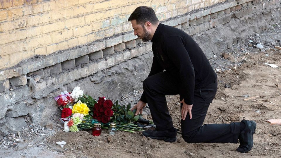President Volodymyr Zelenskyy lays flowers as he pays tribute to 12 people killed by the Russian ballistic missile in Kyiv, Ukraine, on April 25, 2025. (Ukrinform/NurPhoto via Getty Images)