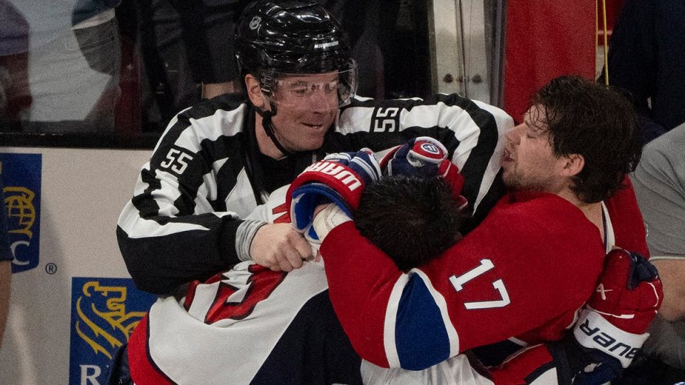 A referee (55) tries to separate Montreal Canadiens’ Josh Anderson (17) and Washington Capitals’ Tom Wilson, front left, as they fight following the second period of Game 3 of a first-round NHL hockey playoff series in Montreal, Friday, April 25, 2025. (Christinne Muschi/The Canadian Press via AP)