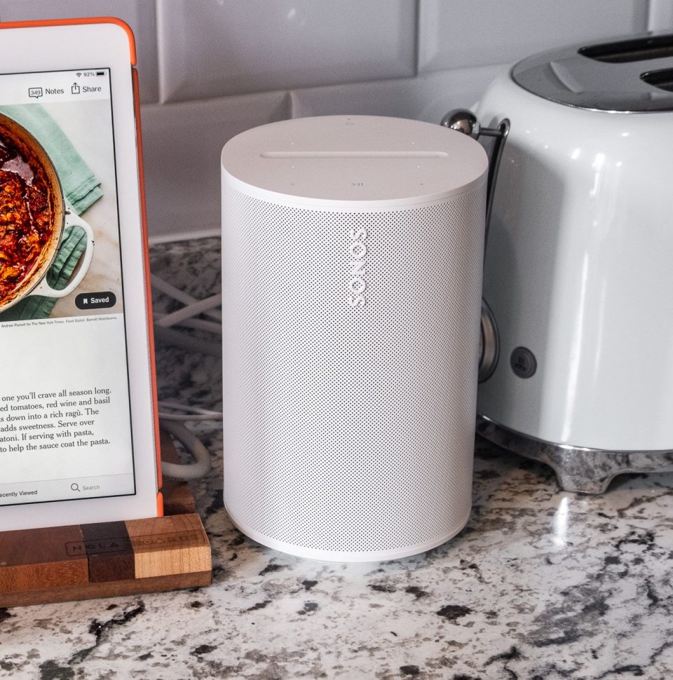 A photo of the Sonos Era 100 speaker in a kitchen setting beside an iPad and toaster.A photo of the Sonos Era 100 speaker in a kitchen setting beside an iPad and toaster.