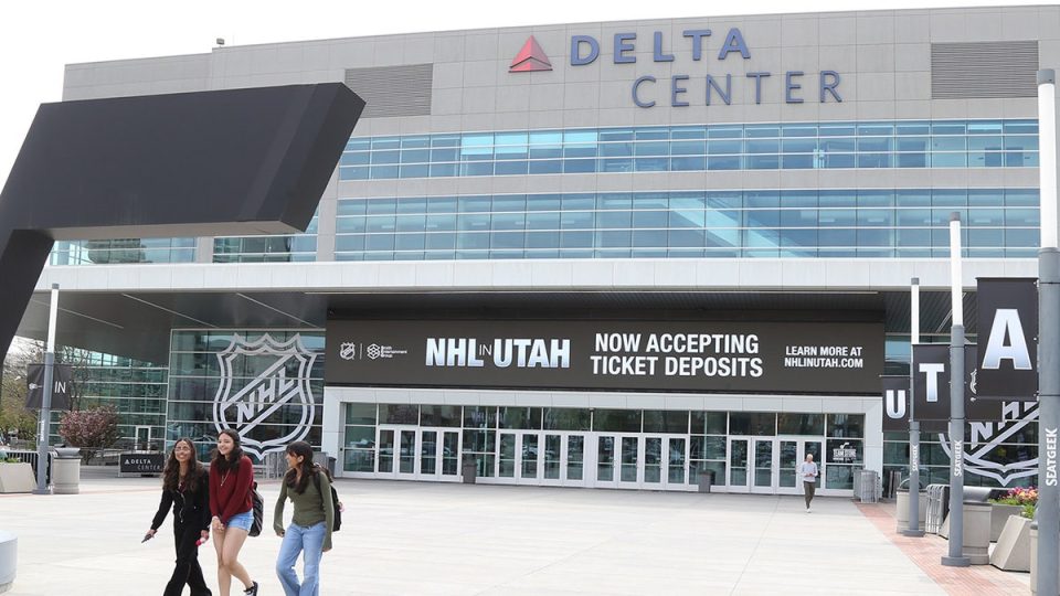 People walk past the main entrance of the Delta Center with the “NHL in Utah” logos on April 19, 2024 in Salt Lake City. The NHL has allowed the sale of the Arizona Coyotes and the team will relocate to Salt Lake City. (Chris Gardner/Getty Images)
