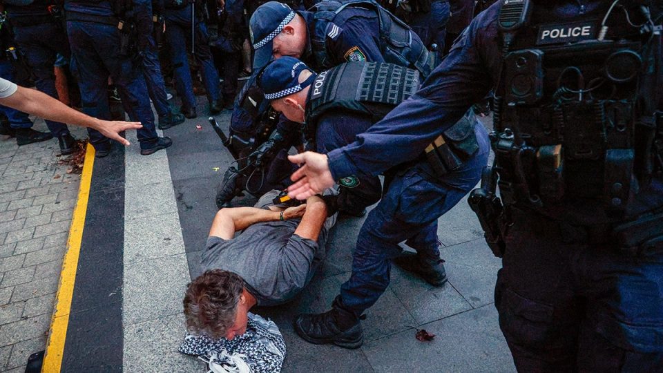 Police detain a protester during a protest against the visit of Israel’s President Isaac Herzog on Feb. 9, 2026 in Sydney, Australia. (Izhar Khan/Getty Images)