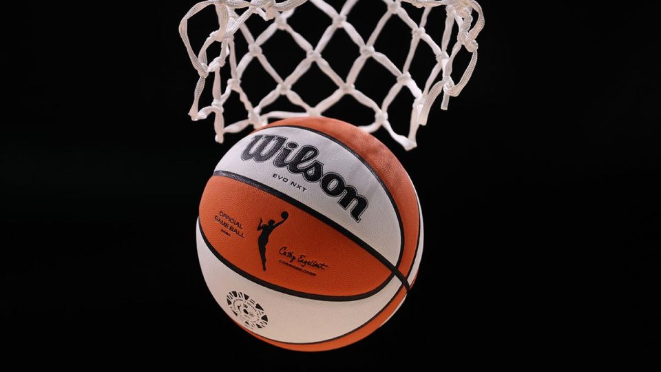 A detail of the WNBA logo is seen on a basketball during warmups between the Seattle Storm and the Connecticut Sun at Climate Pledge Arena on June 20, 2023 in Seattle, Washington. (Steph Chambers/Getty Images)